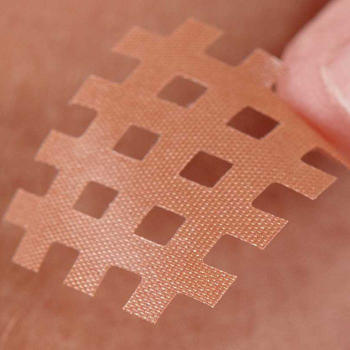 The Kumbrink-developed Crosstape patch is made of dual mixed fibers and is attached to a specially coated backing paper. When pulled off the backing paper, the patch is charged up electrostatically so that it’s ready for specific Crosspuncture Therapy. This means the Crosstape patch has a surplus of electrical charge, once pulled off the backing paper, that cannot discharge by itself. After the Crosstape patch has been charged in this manner, it is applied to the skin to stimulate acupuncture points and the areas of pain, where it slowly releases its electrical charge. Crosstape patches are water-resistant, can be worn for several days without any restriction and do not contain any active ingredients.